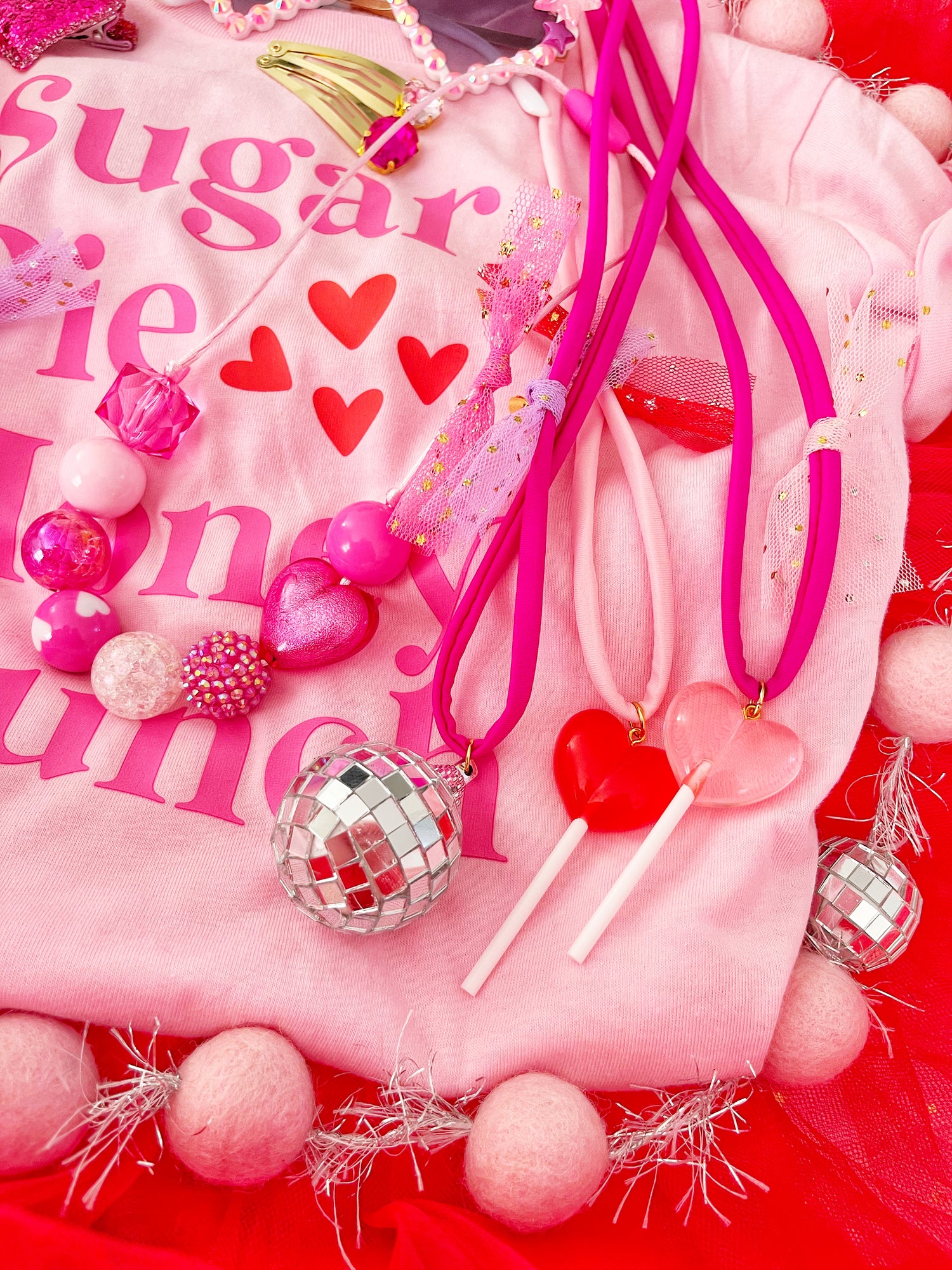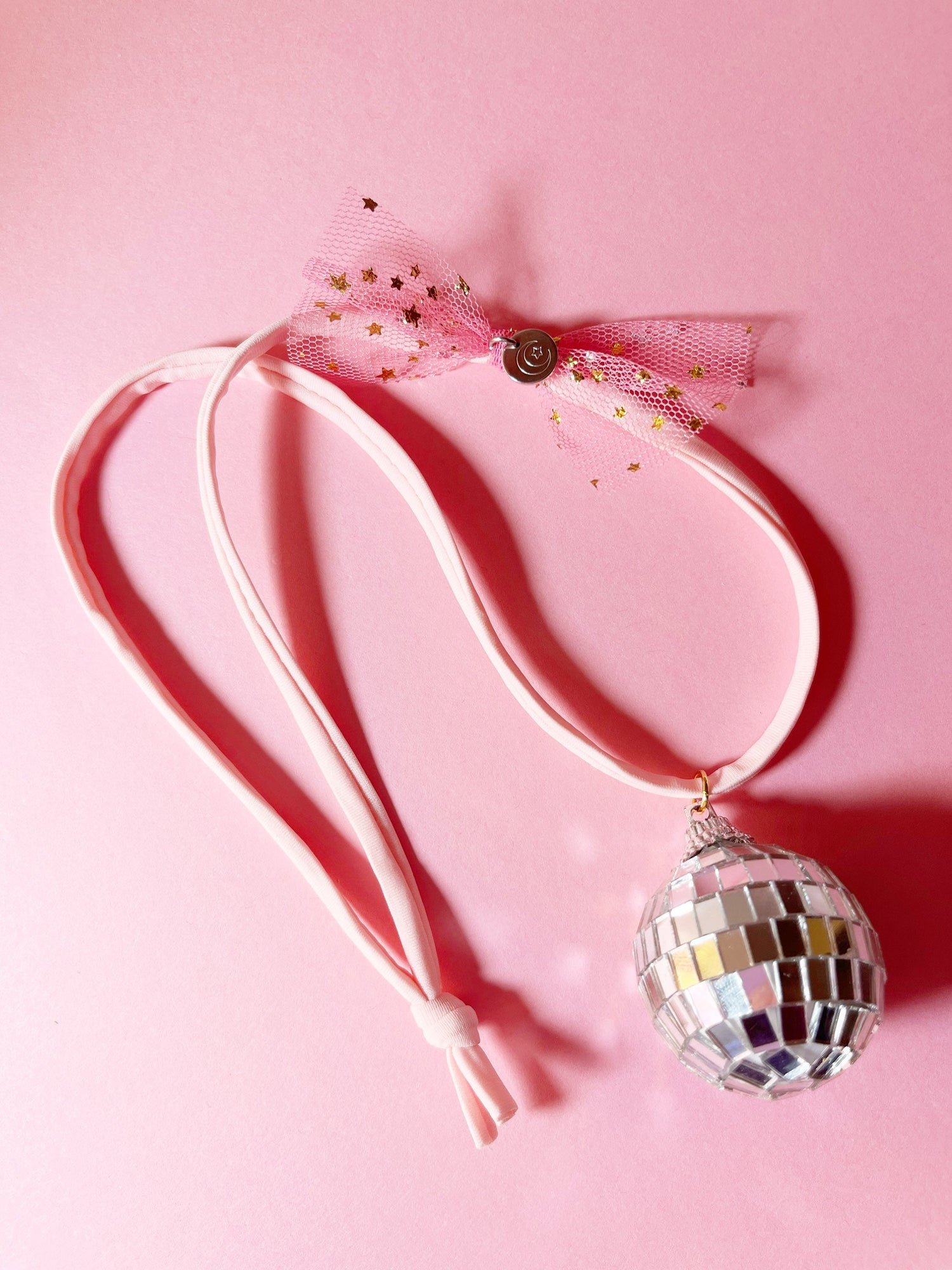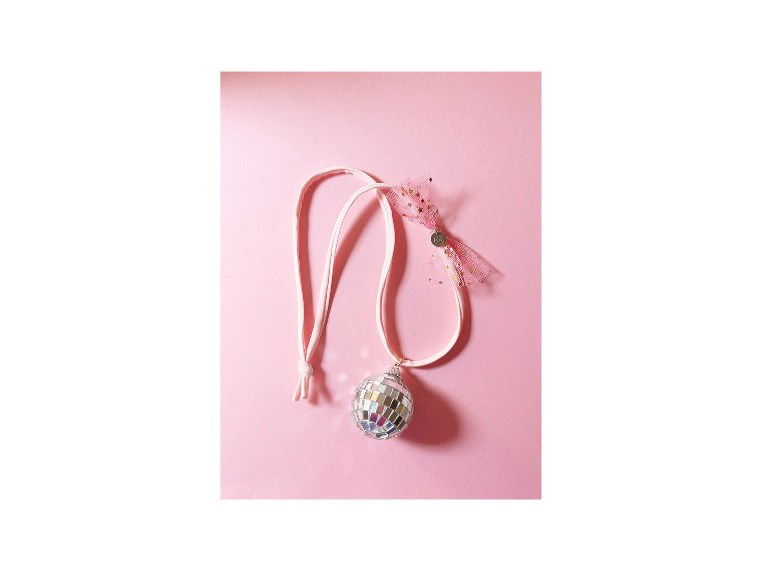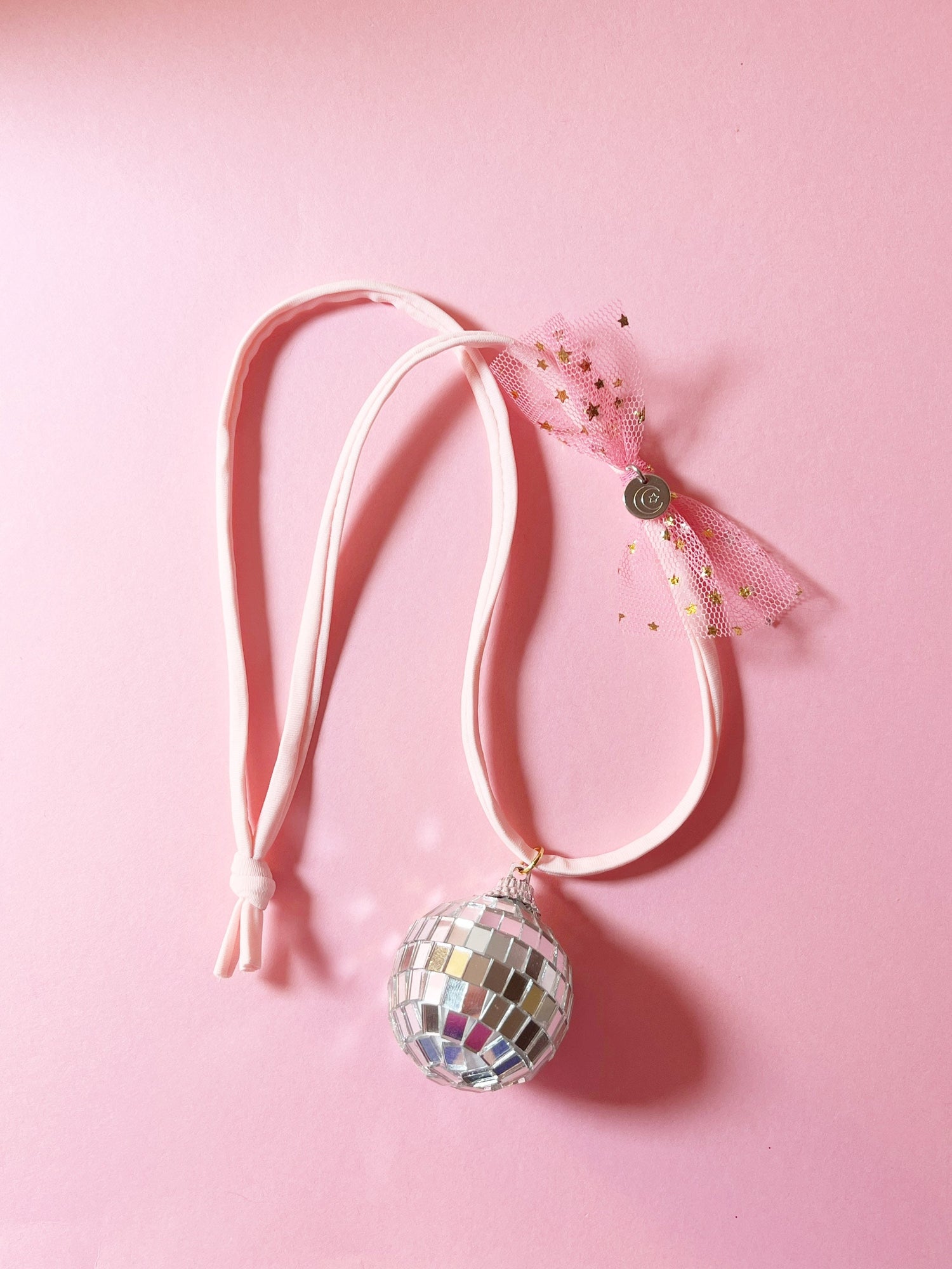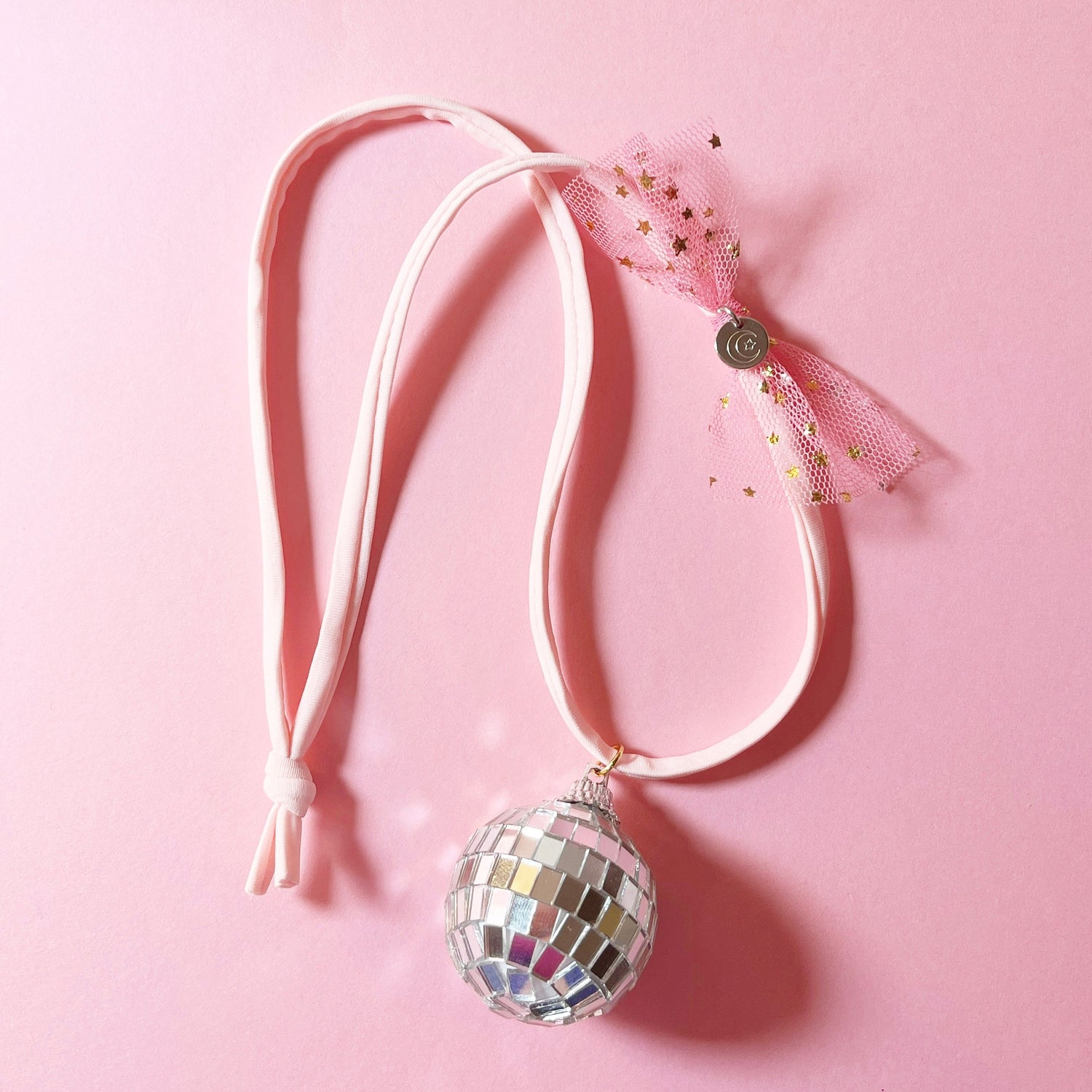 Soft light pink or fuchsia cord, gorgeous reflective disco ball charm, soft tulle & my signature hand stamped disc. Can’t get any more magical than this!