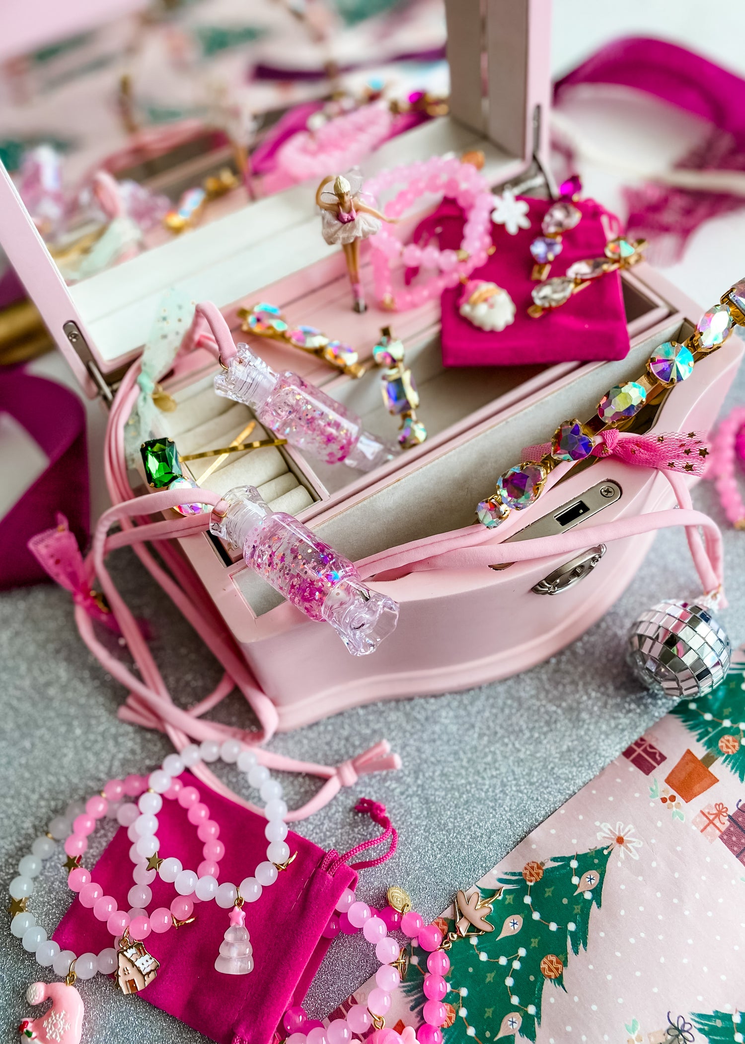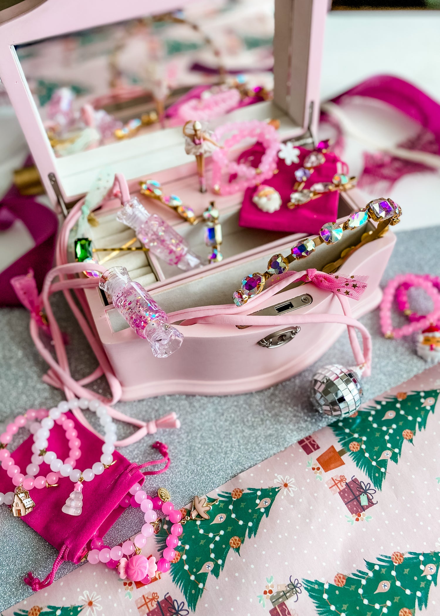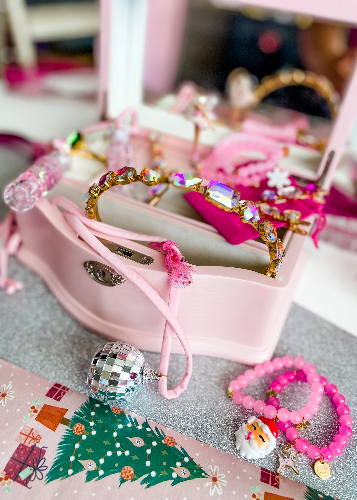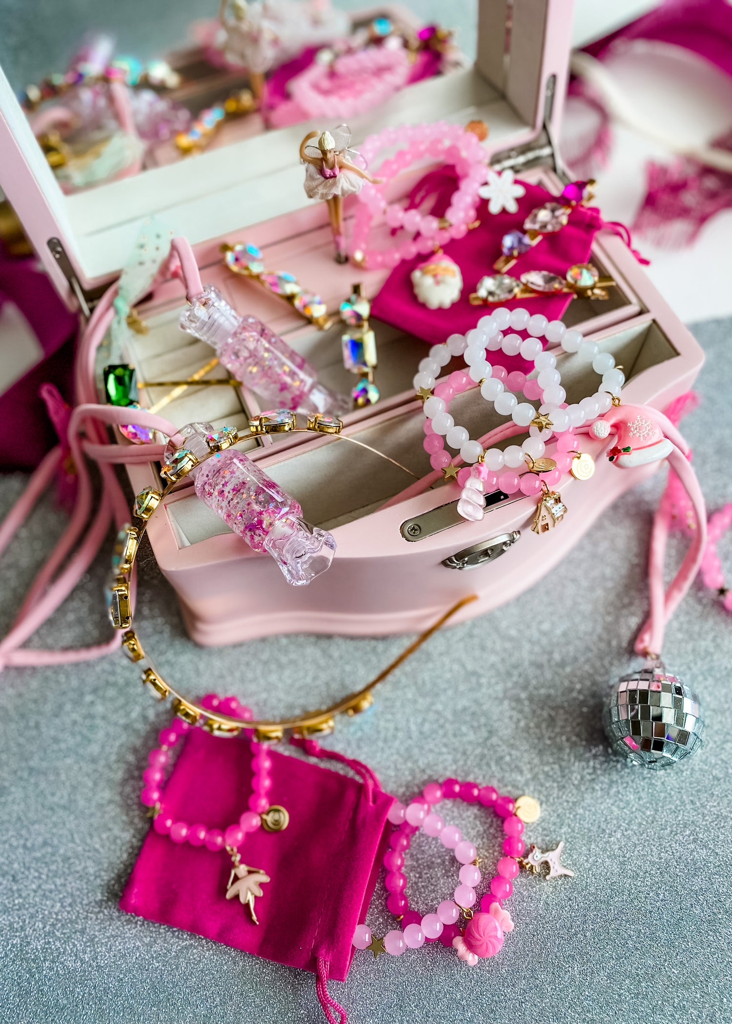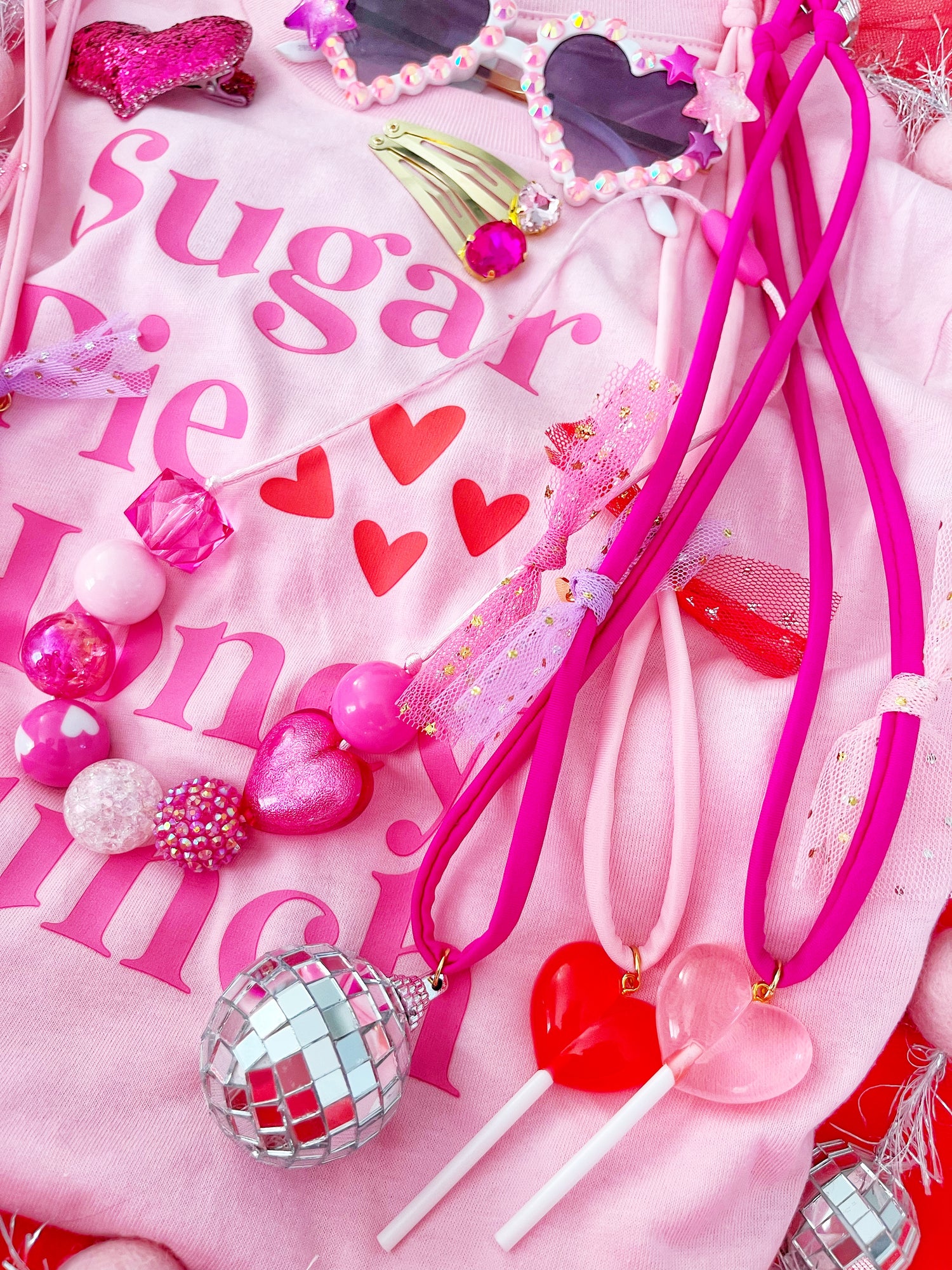 Soft light pink or fuchsia cord, gorgeous reflective disco ball charm, soft tulle & my signature hand stamped disc. Can’t get any more magical than this!