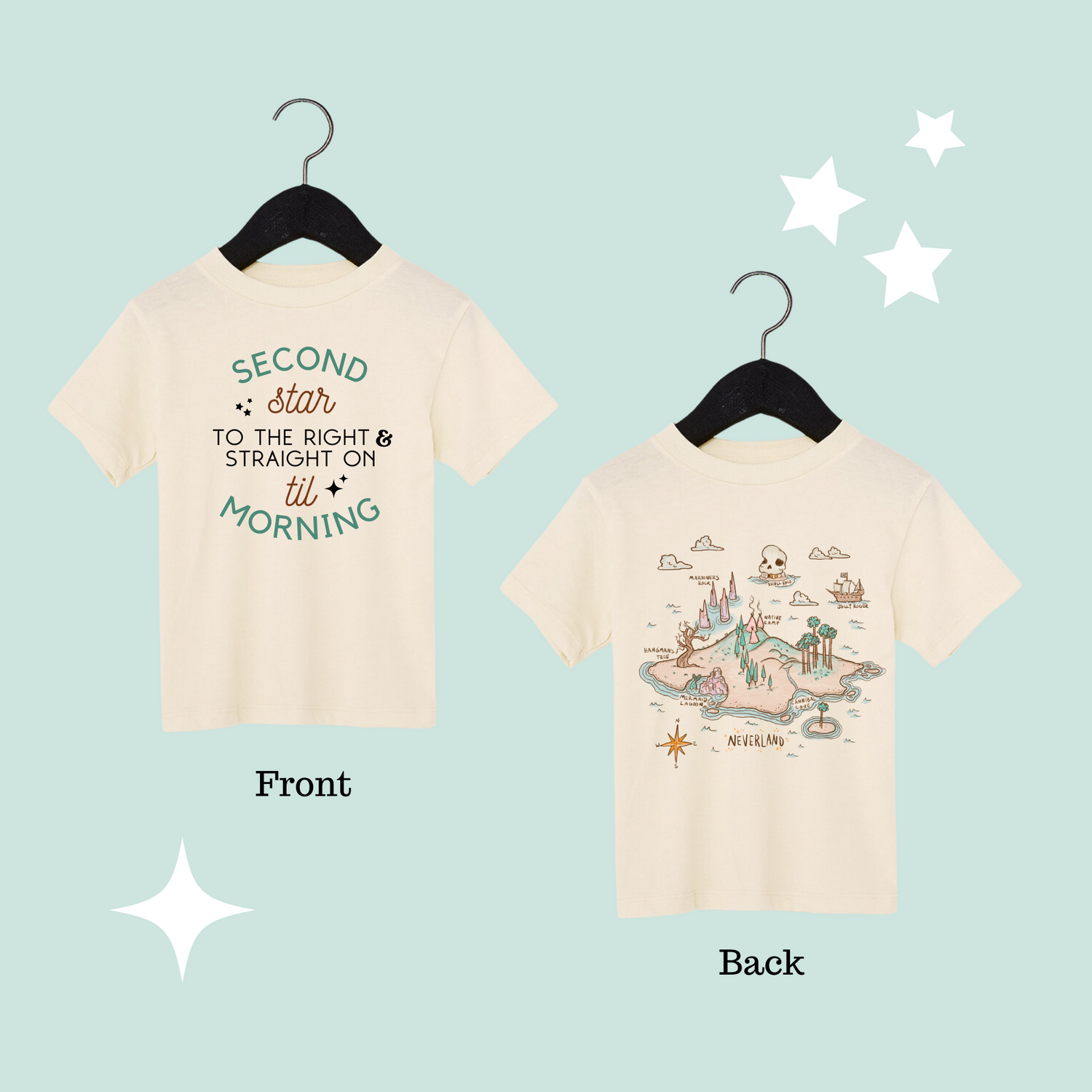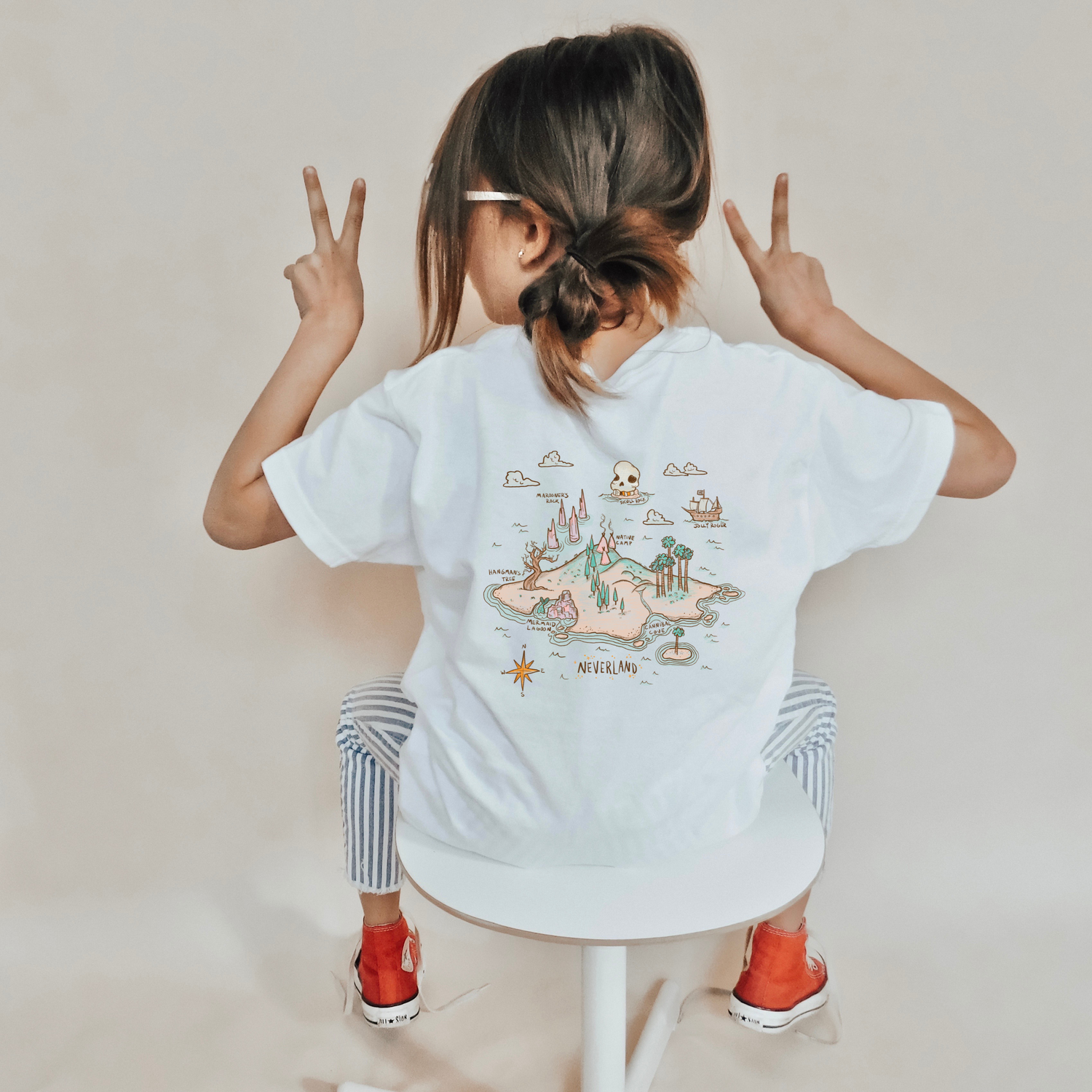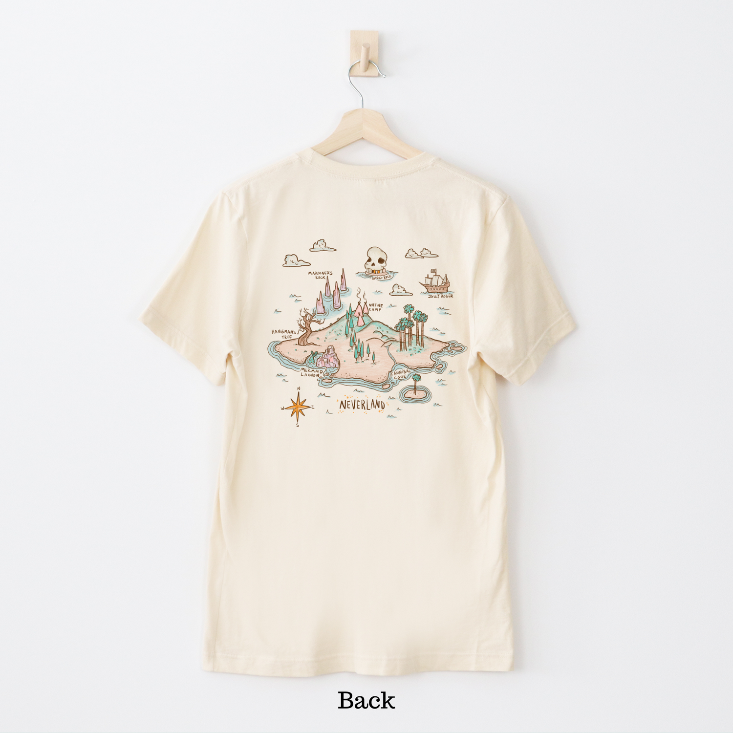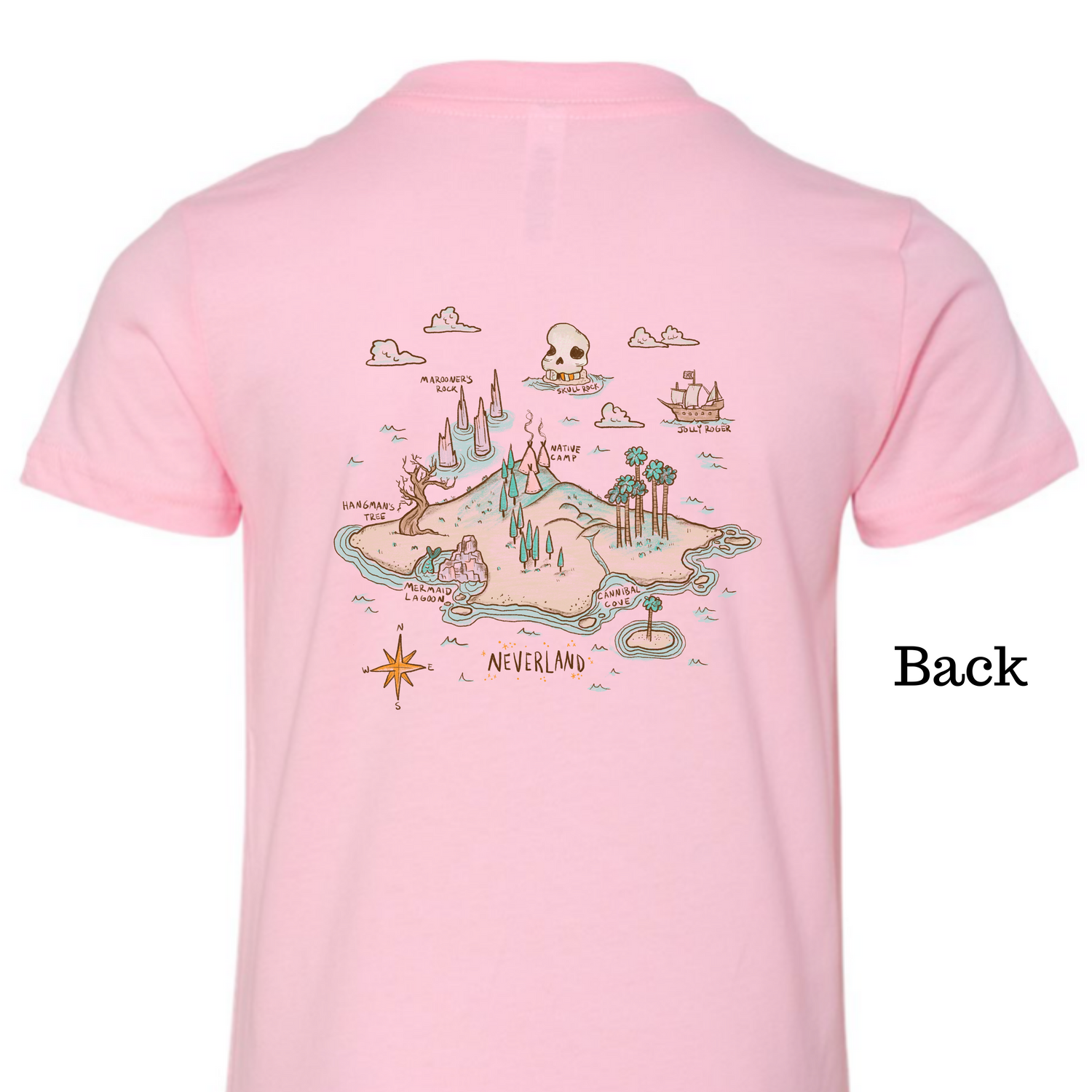 Away we go! This tee is super unique with a map of Neverland from WildDaisyGallery on the back! Perfect for a day in the parks! Comes in toddler, youth and adult sizes!